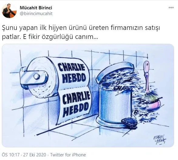 Avukat Mücahit Birinci, Fransız paçavrası Charlie Hebdo'nun tuvalet kağıdına benzetildiği bir karikatür paylaşarak, "Şunu yapan ilk hijyen ürünü üreten firmamızın satışı patlar. E fikir özgürlüğü canım..." çağrısı yaptı.