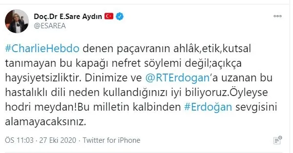 AK Parti İstanbul Milletvekili Sare Aydın, Charlie Hebdo denen paçavranın ahlâk,etik,kutsal tanımayan bu kapağı nefret söylemi değil;açıkça haysiyetsizliktir. Dinimize ve Recep Tayyip Erdoğan'a uzanan bu hastalıklı dili neden kullandığınızı iyi biliyoruz.Öyleyse hodri meydan! Bu milletin kalbinden Erdoğan sevgisini alamayacaksınız" açıklamasında bulundu.