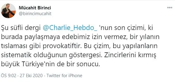 Avukat Mücahit Birinci, Charlie Hebdo'nun ahlaksız karikatürüne "Şu süfli derginin son çizimi, ki burada paylaşmaya edebimiz izin vermez, bir yılanın tıslaması gibi provokatiftir. Bu çizim, bu yapılanların sistematik olduğunun göstergesi. Zincirlerini kırmış büyük Türkiye'nin de bir sonucu" ifadeleriyle tepki verdi.