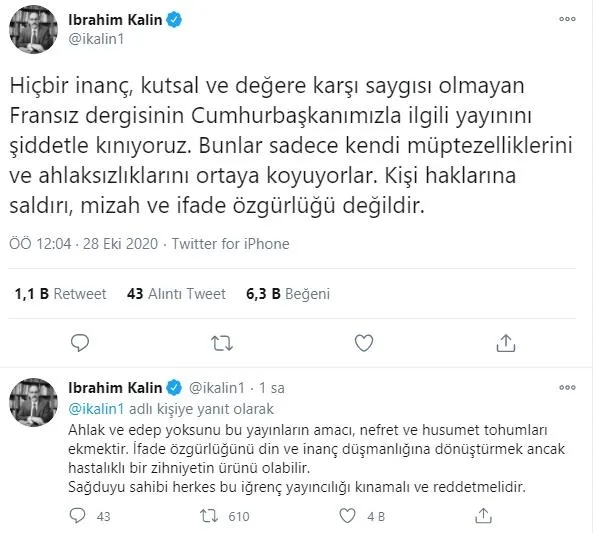 Cumhurbaşkanlığı Sözcüsü İbrahim Kalın, "Hiçbir inanç, kutsal ve değere karşı saygısı olmayan Fransız dergisinin Cumhurbaşkanımızla ilgili yayınını şiddetle kınıyoruz." ifadesini kullandı.