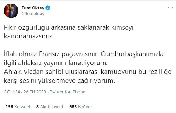 Cumhurbaşkanı Yardımcısı Fuat Oktay, "Fikir özgürlüğü arkasına saklanarak kimseyi kandıramazsınız! İflah olmaz Fransız paçavrasının Cumhurbaşkanımızla ilgili ahlaksız yayınını lanetliyorum. Ahlak, vicdan sahibi uluslararası kamuoyunu bu rezilliğe karşı sesini yükseltmeye çağırıyorum" açıklamasında bulundu.