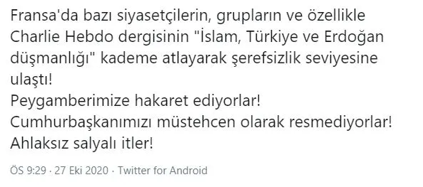 "Fransa Cumhurbaşkanı Emmanuel Macron'un Müslüman karşıtı gündemi meyvesini veriyor! Charlie Hebdo, Cumhurbaşkanımızın yer aldığı alçakça görüntülerle dolu bir sözde karikatür serisi yayımladı. Bu derginin kültürel ırkçılık ve nefreti yaymaya yönelik bu iğrenç ötesi çabasını kınıyoruz. Bu sözde karikatürler tiksindirici olduğu kadar, insani ahlaktan da yoksundur. Bu açıkça, Fransız liderin ülkesi için istediği yabancı düşmanı, İslamofobik ve hoşgörüsüz bir kültürel çevrenin ürünüdür."