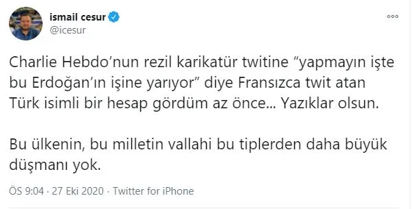 Cumhurbaşkanı Danışmanı İsmail Cesur, Charlie Hebdo'nun rezil karikatür twitine "yapmayın işte bu Erdoğan'ın işine yarıyor" diye Fransızca twit atan Türk isimli bir hesap gördüm az önce... Yazıklar olsun. Bu ülkenin, bu milletin vallahi bu tiplerden daha büyük düşmanı yok" dedi.