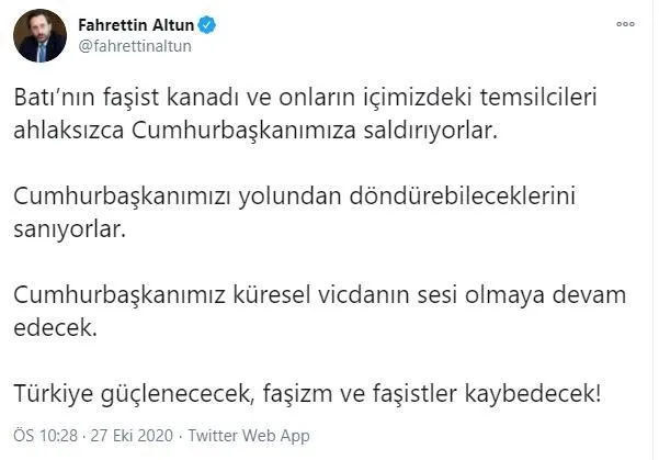 Cumhurbaşkanlığı İletişim Başkanı Fahrettin Altun, Charlie Hebdo'nun Başkan Erdoğan'ı hedef alan skandal karikatürünün ardından sosyal medya hesabı Twitter üzerinden açıklamalarda bulundu.