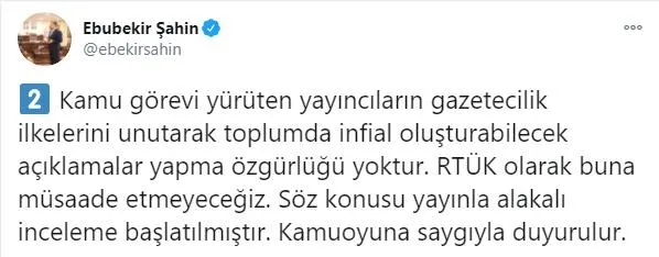 Şahin ayrıca "Kamu görevi yürüten yayıncıların gazetecilik ilkelerini unutarak toplumda infial oluşturabilecek açıklamalar yapma özgürlüğü yoktur. RTÜK olarak buna müsaade etmeyeceğiz. Söz konusu yayınla alakalı inceleme başlatılmıştır. Kamuoyuna saygıyla duyurulur." dedi.