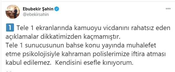 Radyo ve Televizyon Üst Kurulu Başkanı Ebubekir Şahin sosyal medya hesabı Twitter'dan bir paylaşımda bulunarak TELE 1 kanalında yayınlanan bir programda sarfedilen aşağılık sözlere ilişkin açıklamalarda bulundu. Şahin paylaşımında "Tele 1 ekranlarında kamuoyu vicdanını rahatsız eden açıklamalar dikkatimizden kaçmamıştır. Tele 1 sunucusunun bahse konu yayında muhalefet etme psikolojisiyle kahraman polislerimize iftira atması kabul edilemez. Kendisini esefle kınıyorum."