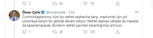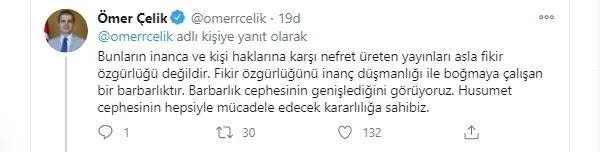 AK Parti sözcüsü Ömer Çelik, Fransa Cumhurbaşkanı Emmanuel Macron'un tahriki ile başlayan ve ırkçı dergi Charlie Hebdo'nun alçak saldırıları ile devam eden İslam ve Müslüman düşmanı yayınlara sosyal medya hesabından sert tepki gösterdi. Çelik bu saldırıların Türkiye'yi yolundan çeviremeyeceğinin altını çizerken "Sağduyu sahibi herkes Cumhurbaşkanımıza karşı yapılan bu nefret yayınını lanetlemelidir" dedi.