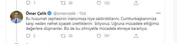 Cumhurbaşkanımızın dirayetli duruşu bu nefret cephesinin ikiyüzlü ahlaksızlığını masada ve sahada yenilgiye uğratmaya devam edecek. Sağduyu sahibi ve inançlara saygılı herkes Cumhurbaşkanımıza karşı yapılan bu nefret yayınını lanetlemelidir.