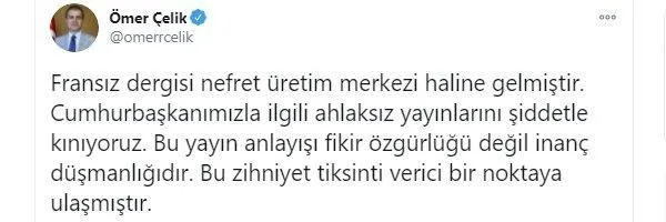 Fransız dergisi nefret üretim merkezi haline gelmiştir. Cumhurbaşkanımızla ilgili ahlaksız yayınlarını şiddetle kınıyoruz. Bu yayın anlayışı fikir özgürlüğü değil inanç düşmanlığıdır.