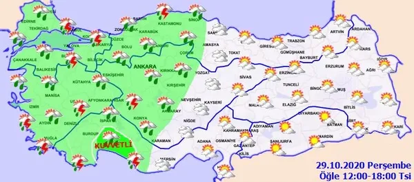 Meteoroloji Genel Müdürlüğü tarafından yapılan son dakika açıklamasına göre: Ülkemizin batı ve iç kesimlerinin parçalı ve yer yer çok bulutlu, Marmara, Ege, Batı Akdeniz, İç Anadolu'nun batısı ve Batı Karadeniz ile Aksaray, Kırşehir ve Çorum çevrelerinin sağanak ve gök gürültülü sağanak yağışlı, diğer yerlerin az bulutlu geçeceği tahmin ediliyor. Yağışların; İzmir, Aydın, Muğla ve Antalya çevreleri ile Isparta'nın güney, Burdur'un doğu ilçelerinde kuvvetli ve yer yer çok kuvvetli (30-75 kg/m2) olması bekleniyor.