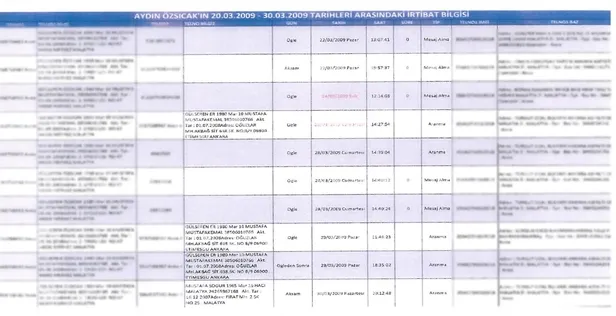 Aydın Özsıcak'ın; 28 Mart 2009tarihinde saat:14.40.12 ile saat:14.40.24'te telefonuna mesaj geldiği tespit edildi. Aydın Özsıcak'ın, 29 Mart 2009 tarihinde saat:11.48.23 ve saat:18.35.02'de arandığı öğrenildi. Özsıcak'ın, 30 Mart 2009 tarihinde saat:20.12.48'de arandığı tespit edildi.