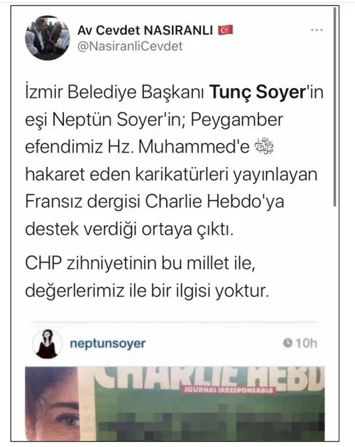 ASKON Diyarbakır Başkanı avukat Cevdet Nasıranlı: "İzmir Belediye Başkanı Tunç Soyer'in eşi Neptün Soyer'in; Peygamber efendimiz Hz. Muhammed'e hakaret eden karikatürleri yayınlayan Fransız dergisi Charlie Hebdo'ya destek verdiği ortaya çıktı. CHP zihniyetinin bu millet ile değerlerimiz ile bir ilgisi yoktur."