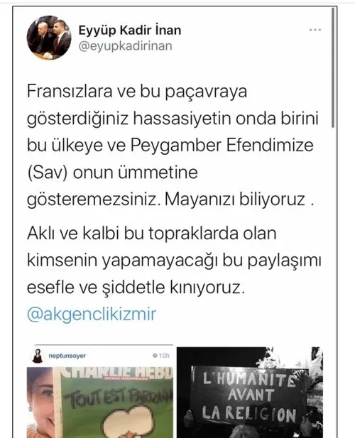 AK Parti İzmir İl Gençlik Kolları Başkanı Eyyüp Kadir İnan: "Fransızlara ve bu paçavraya gösterdiğiniz hassasiyetin onda birini bu ülkeye ve Peygamber Efendimize (sav) onun ümmetine gösteremezsiniz. Mayanızı biliyoruz. Aklı ve kalbi bu topraklarda olan kimsenin yapamayacağı bu paylaşımı esefle ve şiddetle kınıyoruz."
