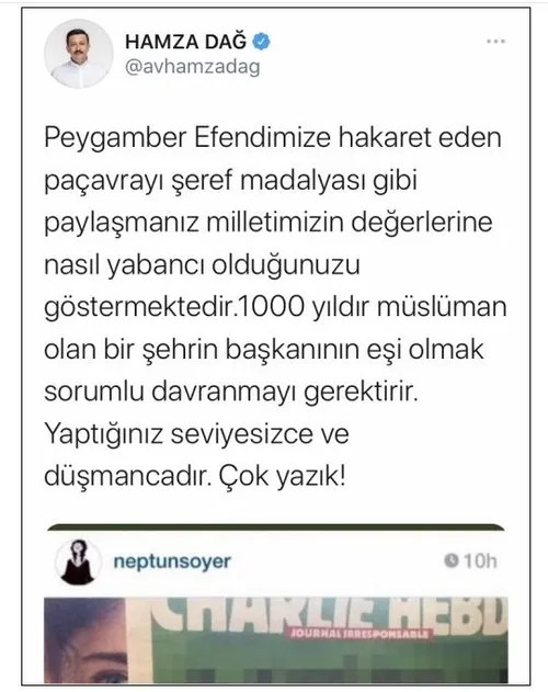 AK Parti Genel Başkan Yardımcısı ve İzmir Milletvekili Hamza Dağ: "Peygamber Efendimize hakaret eden paçavrayı şeref madalyası gibi paylaşmanız milletimizin değerlerine nasıl yabancı olduğunuzu göstermektedir.1000 yıldır müslüman olan bir şehrin başkanının eşi olmak sorumlu davranmayı gerektirir. Yaptığınız seviyesizce ve düşmancadır. Çok yazık!"