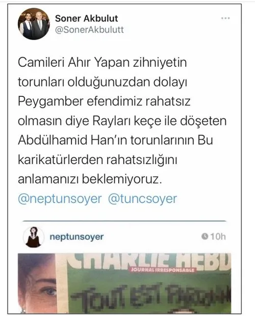 AK Parti Bayraklı Gençlik Kolları Başkanı Soner Akbulut: "Camileri ahır yapan zihniyetin torunları olduğunuzdan dolayı Peygamber efendimiz rahatsız olmasın diye rayları keçe ile döşeten Abdülhamid Han'ın torunlarının bu karikatürlerden rahatsızlığını anlamanızı beklemiyoruz.."
