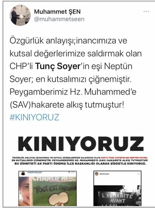 AK Parti Ödemiş İlçe Başkanı Muhammet Şen: "Özgürlük anlayışı; inancımıza ve kutsal değerlerimize saldırmak olan CHP'li Tunç Soyer'in eşi Neptün Soyer; en kutsalımızı çiğnemiştir. Peygamberimiz Hz. Muhammed'e (sav) hakarete alkış tutmuştur! Kınıyoruz.."