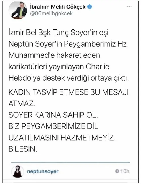 Ankara Büyükşehir Belediye Eski Başkanı Melih Gökçek: "İzmir Belediye Başkanı Tunç Soyer'in eşi Neptün Soyer'in Peygamberimiz Hz. Muhammed'e hakaret eden karikatürleri yayınlayan Charlie Hebdo'ya destek verdiği ortaya çıktı. Kadın tasvip etmese bu mesajı atmaz. Soyer karına sahip ol. Biz Peygamberimize dil uzatılmasını hazmetmeyiz. Bilesin."