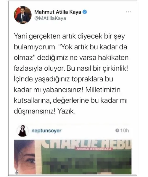 AK Parti MKYK Üyesi ve İzmir Milletvekili Mahmut Atilla Kaya: "Yani gerçekten artık diyecek bir şey bulamıyorum. 'Yok artık bu kadar da olmaz' dediğimiz ne varsa hakikaten fazlasıyla oluyor. Bu nasıl bir çirkinlik! İçinde yaşadığınız topraklara bu kadar mı yabancısınız! Milletimizin kutsallarına, değerlerine bu kadar mı düşmansınız! Yazık."