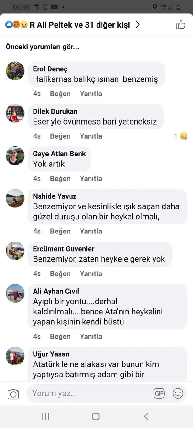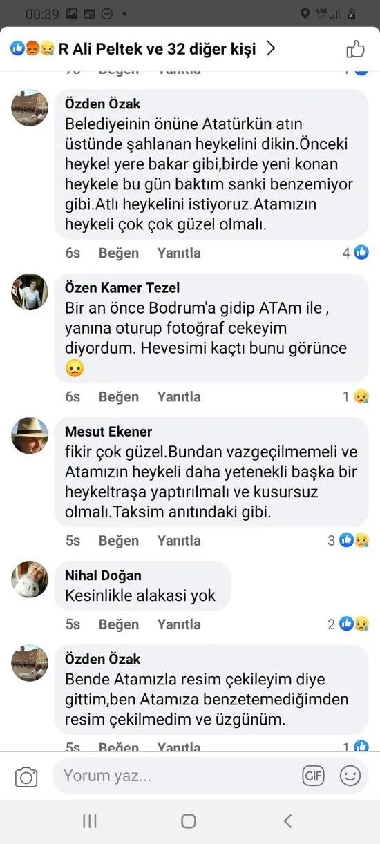 *Belediyenin önüne Atatürk'ün atın üzerinde şahlanan heykelini dikin. Önceki heykel yere bakar gibi, bir de yeni konan heykele bu gün baktım sanki benzemiyor gibi. Atlı heykelini istiyoruz. Atamızın heykeli çok güzel olmalı.