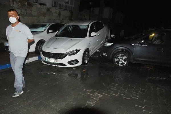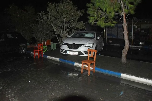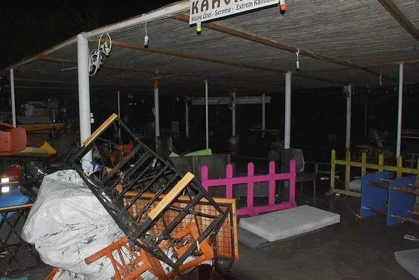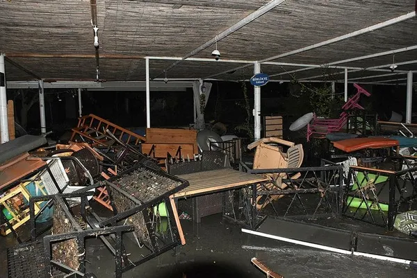 Denizden gelen dev dalgalar sahil kenarındaki işletmelere ait masa ve sandalyeleri sürükleyerek yerle bir etti.