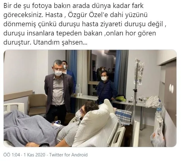 Bir vatandaş ise Özgür Özel'in skandal tavrını "Hasta , Özgür Özel'e dahi yüzünü dönmemiş çünkü duruşu hasta ziyareti duruşu değil , duruşu insanlara tepeden bakan ,onları hor gören duruştur. Utandım şahsen..." ifadeleriyle yorumladı.