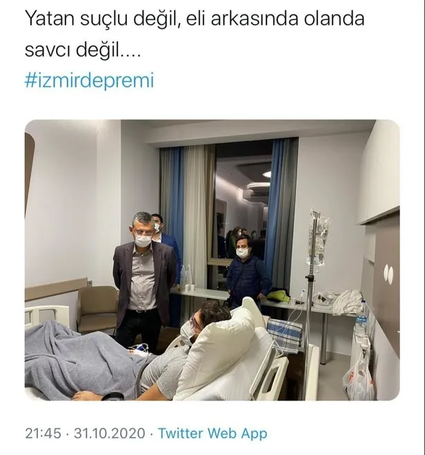Türkiye, İzmir depreminin yaralarını sararken CHP Grup Başkanvekili Özgür Özel skandal bir harekete imza attı. Bir depremzedeyi hastanede ziyaret eden CHP'li Özel, ellerini arkaya bağlayarak takındığı tavır sosyal medyada gündem oldu. Sağlık Bakanı Fahrettin Koca ve TBMM Başkanı Mustafa Şentop'un hastalara karşı yaklaşımı ile CHP'li Özgür Özel'in ellerini arkadan bağladığı fotoğrafı yorumlayan vatandaşlar, Özel'e büyük tepki gösterdi. Bir sosyal medya kullanıcısı "Özgür Özel'e insanlık dersi şart" ifadelerini kullandı.