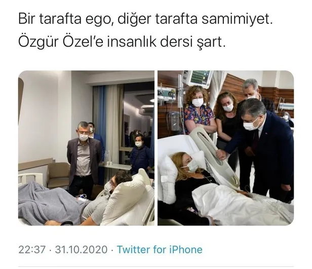 Bir başka sosyal medya kullancısı ise Sağlık Bakanı Fahrettin Koca ve Özgür Özel'in fotoğraflarını karşılaştırarak, "Bir tarafta ego, diğer tarafta samimiyet. Özgür Özel'e insanlık dersi şart" ifadelerini kullandı.