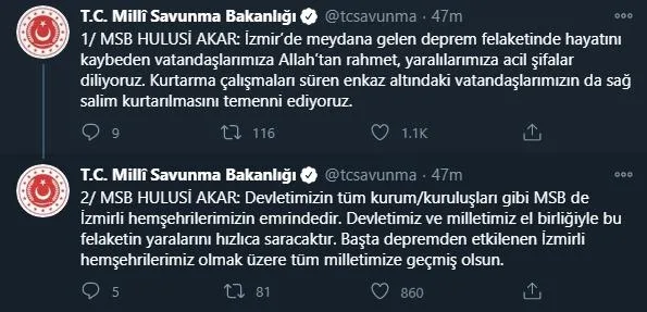 16.33: "İzmir, Muğla ve Aydın'da 115 sahada enerji ve 10 sahada servis kesintisi bulunmakta olup kesintilerin giderilmesi için ekipler çalışmaktadır. Depremden etkilenen tüm illerde alan tarama çalışmaları devam ediyor. TSK tarafından havadan tarama çalışmaları yürütülüyor."