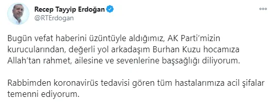 Erdoğan, "Bugün vefat haberini üzüntüyle aldığımız, AK Parti'mizin kurucularından, değerli yol arkadaşım Burhan Kuzu hocamıza Allah'tan rahmet, ailesine ve sevenlerine başsağlığı diliyorum. Rabbimden koronavirüs tedavisi gören tüm hastalarımıza acil şifalar temenni ediyorum." dedi.