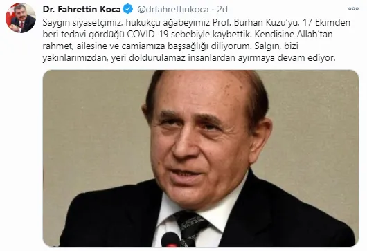 Konuyla ilgili Twitter hesabından açıklama yapan Sağlık Bakanı Fahrettin Koca, "Saygın siyasetçimiz, hukukçu ağabeyimiz Prof. Burhan Kuzu'yu, 17 Ekimden beri tedavi gördüğü COVID-19 sebebiyle kaybettik. Kendisine Allah'tan rahmet, ailesine ve camiamıza başsağlığı diliyorum. Salgın, bizi yakınlarımızdan, yeri doldurulamaz insanlardan ayırmaya devam ediyor" dedi.