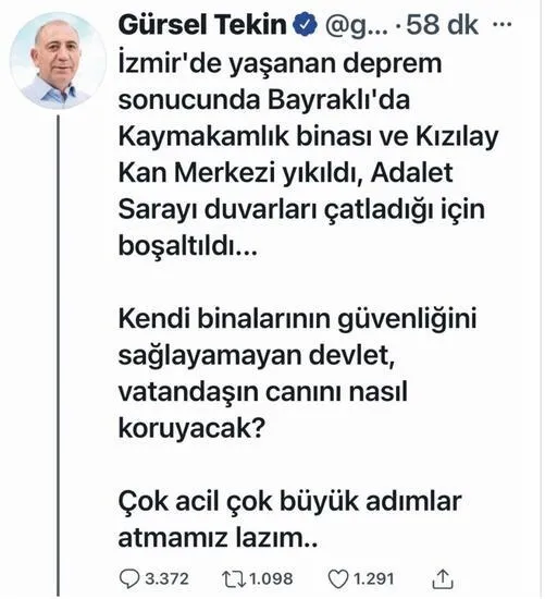 "İzmir'de yaşanan deprem sonucunda Bayraklı'da Kaymakamlık binası ve Kızılay Kan Merkezi yıkıldı, Adalet Sarayı duvarları çatladığı için boşaltıldı. Kendi binalarının güvenliğini sağlayamayan devlet, vatandaşın canını nasıl koruyacak? Çok acil adımlar atmamız lazım."