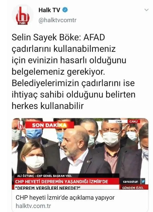 "Aaah ah enkazlarla mı uğraşalım, bu tür haberlerle mi bilmiyorum. Ne olur yük olmayın, yardımcı olun. İzmir Büyükşehir Belediyesi'nin de dahil olduğu koordinasyon ile ve eşit şartlarda yardım ulaştırıyoruz. Hiçbir binaya hasarlı olduğuna dair henüz belge verilmedi."