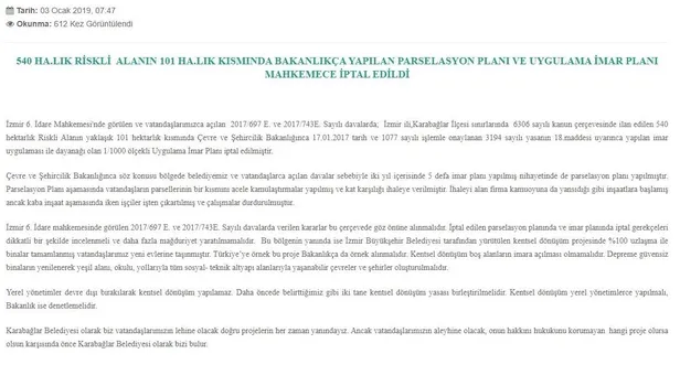 Karabağlar Belediyesi, mahkeme kararı sonrası yaptığı açıklamada "Yerel yönetimler devre dışı bırakılarak kentsel dönüşüm yapılamaması gerektiği" iddia edildi.