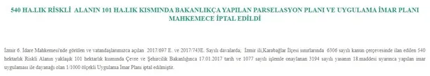 Çalışmalar sürerken, hazırlanan planlar için Karabağlar Belediyesi planların iptali istemiyle İzmir 6'ncı İdare Mahkemesi'nde dava açtı, dosyayı inceleyen mahkeme, parselasyon dağıtımlarının hatalı olduğu ve kamu ortaklık payı kesintilerinin yanlış hesaplandığı iddiasıyla planların iptaline hükmetti. Bu kararın ardından, inşaat bölgesi plansız kaldı.