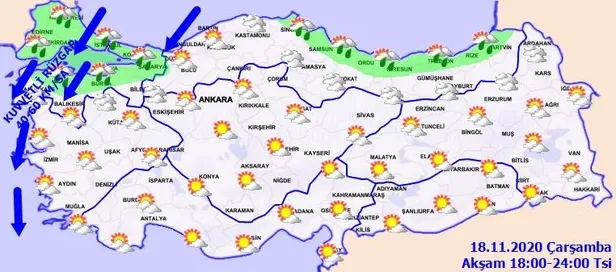 Meteoroloji Genel Müdürlüğü tarafından yapılan son değerlendirmelere göre, yurdun kuzey kesimleri ile zamanla batı kesimlerinin parçalı yer yer çok bulutlu, Marmara'nın kuzeyi, Orta ve Doğu Karadeniz kıyıları, Sinop ve Bursa çevreleri, Çanakkale'nin doğu, Balıkesir'in kuzey kesimleri ile gece saatlerinden sonra İzmir, Aydın, Muğla ve Denizli çevrelerinin aralıklı yağmur ve sağanak yağışlı, diğer yerlerin az bulutlu geçeceği tahmin ediliyor. Sabah saatlerinde Marmara'nın güney ve doğusu, İç Ege, İç Anadolu, Batı Karadeniz'in iç kesimleri ile Şanlıurfa ve Batman çevrelerinde yer yer pus ve sis bekleniyor.