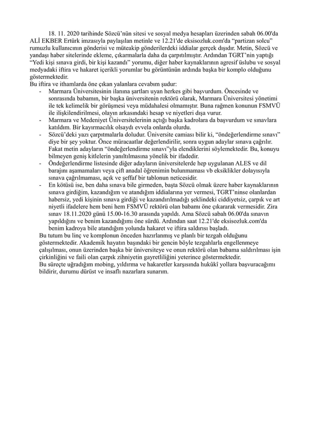"Marmara Üniversitesi'nin Araştırma Görevlisi kadrosuna şartları tutan herkes gibi müracaat ettim. Bu müracaatım öncesinde ve sonrasında babamın, bir başka üniversitenin rektörü olarak, Marmara Üniversitesi yönetimi ile tek kelimelik bir görüşmesi veya müdahalesi olmamıştır. Buna rağmen konunun Fatih Sultan Mehmet Vakıf Üniversitesi ile ilişkilendirilmesi, olayın arkasındaki hesap ve niyetlerin dışa vurulmasıdır. Ben, Marmara ve Medeniyet Üniversitelerinin açtığı başka kadrolara da başvurdum ve sınavlara katıldım. Bir kayırmacılık teşebbüsü olsaydı onlarda olurdu. Sözcü'deki yazı çarpıtmalarla doludur. Üniversite camiası bilir ki, 'öndeğerlendirme sınavı' diye bir sınav yoktur. Müracaatlar ilgili birim tarafından değerlendirilir, uygun adaylar sınava çağrılır. Fakat haber metni, adayların 'öndeğerlendirme sınavı' sonucu elendiklerini söylemektedir. Bu, konuyu bilmeyen geniş kitlelerin yanıltılmasına yönelik bir ifadedir."