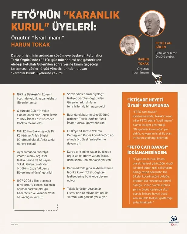 Darbe girişiminin ardından çözülmeye başlayan Fetullahçı Terör Örgütü'nde (FETÖ) güç mücadelesi baş gösterirken, elebaşı Fetullah Gülen'den sonra yerine kimin geçeceği tartışması, gözleri örgüt yöneticilerinden oluşan "karanlık kurul üyeleri"ne çevirdi. Terör örgütü elebaşı Fetullah Gülen öldükten sonra yerine geçeceği söylenen isimlerden Harun Tokak, 1997-2008 yılları arasında elebaşı Gülen'in onursal başkanı olduğu Gazeteciler ve Yazarlar Vakfının başkanlığını yürüttü. Elebaşının sözcülüğünü üstlenen Tokak, Gülen tarafından örgütün "dış ülkeler koordinatörü", ardından 2015'te de "İsrail İmamı" olarak görevlendirildi.