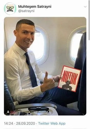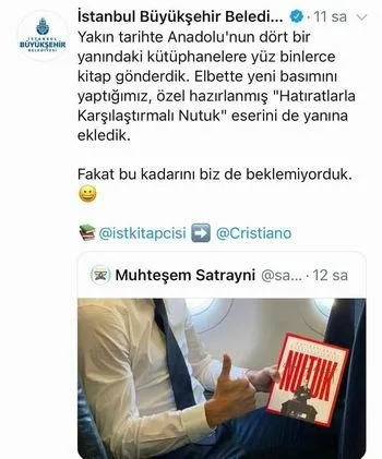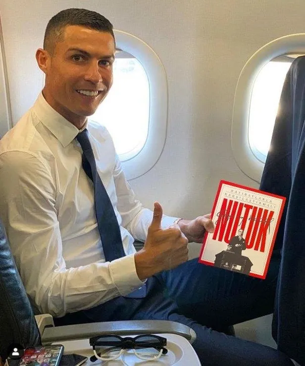 (Cristiano Ronaldo) Burada da şunu söylüyor: 'Yakın tarihte Anadolu'nun dört bir yanındaki kütüphanelere yüz binlerce kitap gönderdik. Elbette yeni basımını yaptığımız, özel hazırlanmış 'Hatıratlarla Karşılaştırmalı Nutuk' eserini de yanına ekledik. Fakat bu kadarını biz de beklemiyorduk.'"