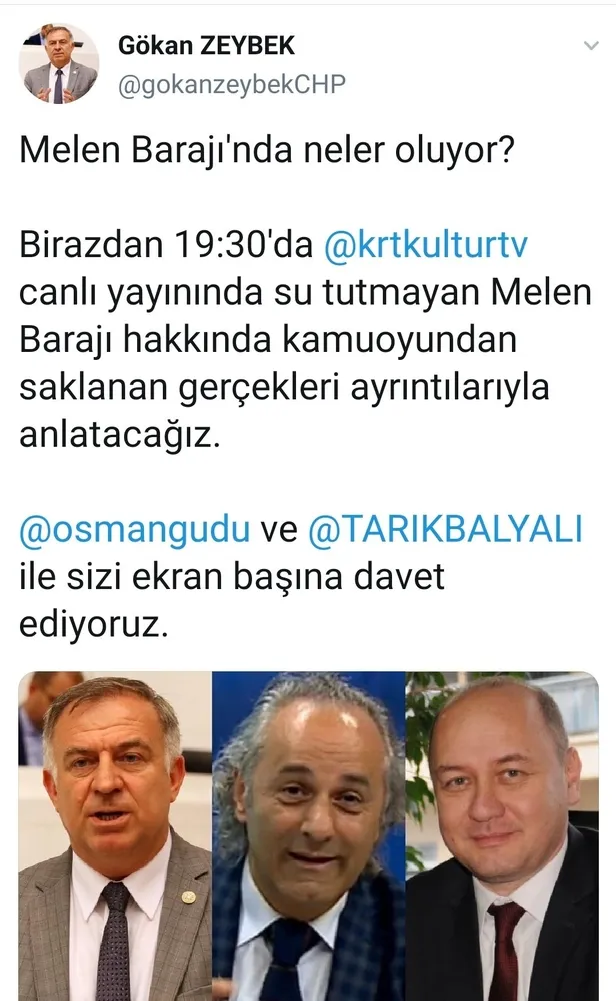 CHP PM Üyesi ve İstanbul Milletvekili Gökan Zeybek de, 17 Ekim 2020 tarihinde yaptığı paylaşımda, "Melen Barajı'nda neler oluyor? Birazdan canlı yayınında su tutmayan Melen Barajı hakkında kamuoyundan saklanan gerçekleri ayrıntılarıyla anlatacağız" iddiasında bulundu.