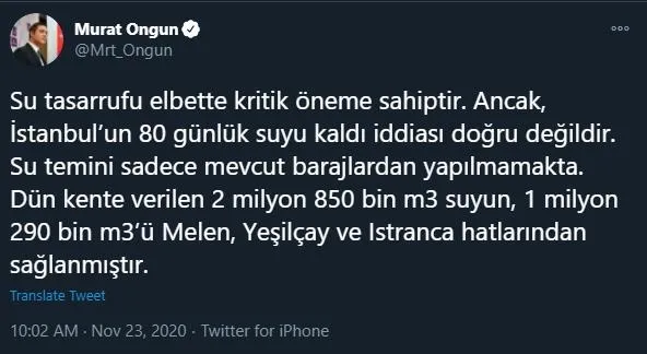 İBB Sözcüsü Murat Ongun, sosyal paylaşım sitesi Twitter'daki resmi hesabından açıklamada bulundu ve "Su tasarrufu elbette kritik öneme sahiptir. Ancak, İstanbul'un 80 günlük suyu kaldı iddiası doğru değildir. Su temini sadece mevcut barajlardan yapılmamakta. Dün kente verilen 2 milyon 850 bin m3 suyun, 1 milyon 290 bin m3'ü Melen, Yeşilçay ve Istranca hatlarından sağlanmıştır" ifadelerini kullandı.