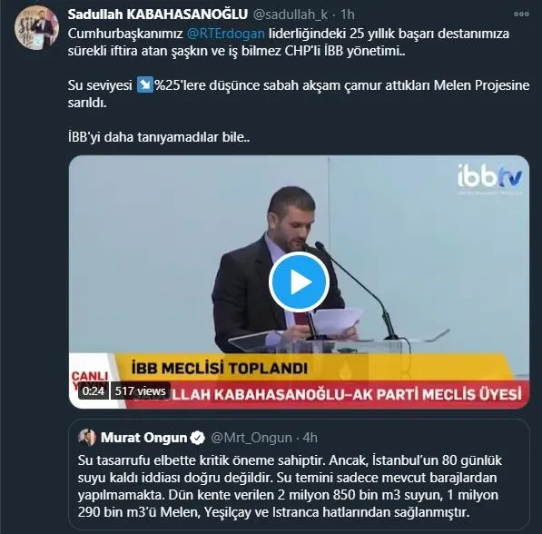 Beykoz Belediyesi Meclis Üyesi Sadullah Kabahasanoğlu; İBB Sözcüsü Murat Ongun'un paylaşımını etiketleyerek, "Cumhurbaşkanımız Recep Tayyip Erdoğan liderliğindeki 25 yıllık başarı destanımıza sürekli iftira atan şaşkın ve iş bilmez CHP'li İBB yönetimi.. Su seviyesi yüzde 25'lere düşünce sabah akşam çamur attıkları Melen Projesine sarıldı. İBB'yi daha tanıyamadılar bile.." dedi.