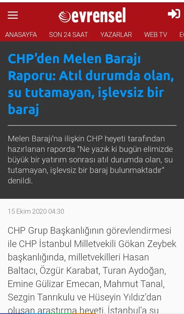 CHP Grup Başkanlığının görevlendirmesi ile CHP İstanbul Milletvekili Gökan Zeybek başkanlığında, milletvekilleri Hasan Baltacı, Özgür Karabat, Turan Aydoğan, Emine Gülizar Emecan, Mahmut Tanal, Sezgin Tanrıkulu ve Hüseyin Yıldız'dan oluşan araştırma heyeti, İstanbul'a su sağlamak üzere projelendirilen Melen Barajı hakkında rapor hazırlamıştı.