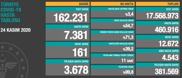 Koronavirüs salgını devam ederken, günlük vaka sayısı tablosu açıklandı. Sağlık Bakanlığı'nın verilerine göre, Türkiye'de son 24 saatte 162 bin 231 Kovid-19 testi yapıldı, 7 bin 381 kişiye hastalık tanısı konuldu, 161 kişi hayatını kaybetti.