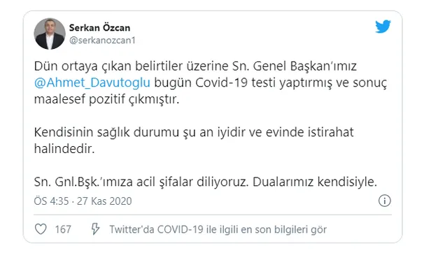 Özcan Twitter hesanındn yaptığı açıklamada, "Dün ortaya çıkan belirtiler üzerine Sn. Genel Başkan'ımız @Ahmet_Davutoglu bugün Covid-19 testi yaptırmış ve sonuç maalesef pozitif çıkmıştır. Kendisinin sağlık durumu şu an iyidir ve evinde istirahat halindedir. Sn. Gnl.Bşk.'ımıza acil şifalar diliyoruz. Dualarımız kendisiyle." ifadelerini kullandı.