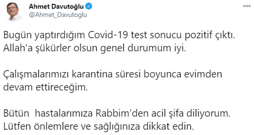 Konuyla ilgili açıklamalarda bulunan Ahmet Davutoğlu, "Bugün yaptırdığım Covid-19 test sonucu pozitif çıktı. Allah'a şükürler olsun genel durumum iyi. Çalışmalarımızı karantina süresi boyunca evimden devam ettireceğim. Bütün hastalarımıza Rabbim'den acil şifa diliyorum. Lütfen önlemlere ve sağlığınıza dikkat edin" ifadelerini kullandı.
