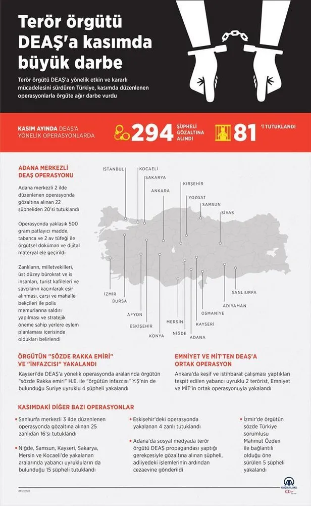 Son dakika haberine göre, Terör örgütü DEAŞ'a karşı etkin ve kararlı mücadelesini sürdüren Türkiye, geçen ay yurt genelindeki operasyonlarla örgüte büyük darbe vurdu, teröristlerin planladığı eylemler güvenlik güçlerinin başarılı çalışmalarıyla engellendi.