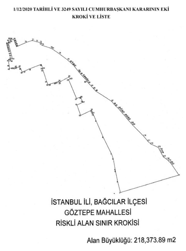 Son dakika haberleri... Resmi Gazete'de yayımlanan Cumhurbaşkanı Kararına göre, İstanbul'un Bağcılar ilçesi Göztepe Mahallesi sınırları içinde bulunan bölgenin, riskli alan ilan edilmesine karar verildi.