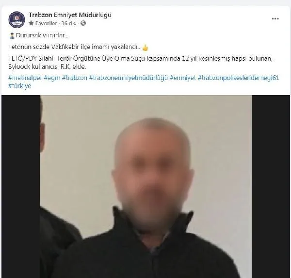 Son dakika haberine göre, Trabzon’da polisin düzenlediği operasyonda, FETÖ soruşturması kapsamında 12 yıl hapisle aranan örgütün 'Vakfıkebir mahrem imamı’ ve 'ByLock' kullanıcısı R.K, yakalanarak gözaltına alındı.