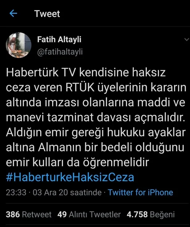 Karara tepki gösteren Habertürk gazetesi yazarı Fatih Altaylı, Twitter hesabından RTÜK üyelerine tehditler savuran bir mesaj yayınladı. Altaylı, kısa sürede binlerce kişiye ulaşan mesajı daha sonra sildi. Altaylı'nın kahraman ordumuza yapılan hakaretleri görmezden gelerek RTÜK'ü hedef tahtasına koyması tepki çekti.