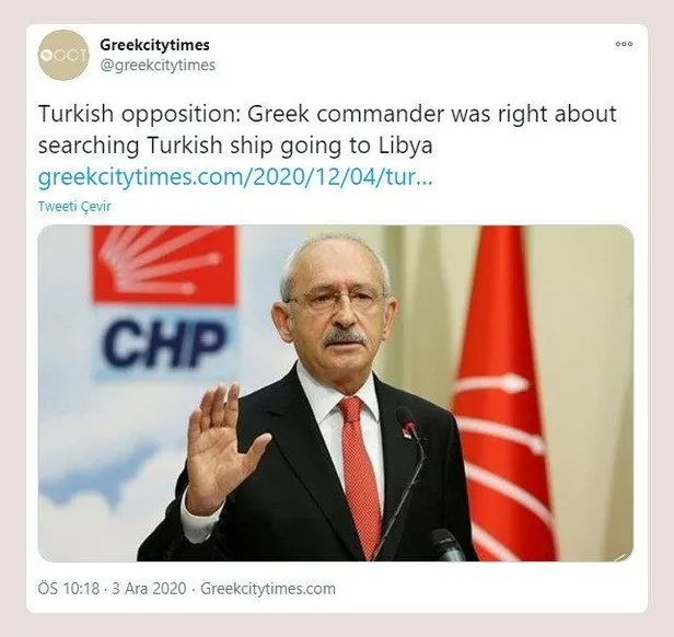 CHP lideri Kemal Kılıçdaroğlu yine ülkesinin yanında yer almak yerine Türkiye düşmanlarıyla el ele vermeyi tercih etti. Libya’ya giden Türk gemisinin hukuk dışı bir şekilde aranması olayında Türkiye’yi suçlayan CHP Genel Başkanı Kılıçdaroğlu, Yunanistan medyasında manşet oldu. Greek City Times, Kılıçdaroğlu’nun açıklamasını "Türk muhalefeti: Yunan komutan Libya'ya giden Türk gemisini aramakta haklıydı" ifadeleriyle okuyucusuyla paylaştı.